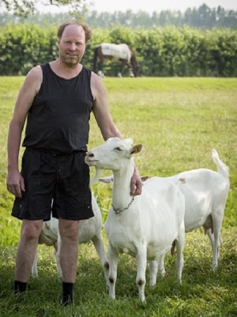 Witte melkgeiten, in het weiland ernaast lopen een tiental schapen en dan heeft hij ook nog zo’n dertig zwartbonte melkkoeien. De koeien noemt hij zijn broodwinning, zijn geiten z’n grootste hobby.