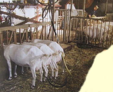 Terwijl de melkmachine zijn werk doet, eten de geiten hun maaltje op. |