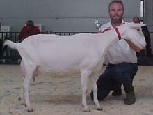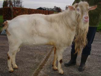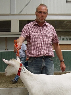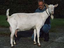 Brede lijn Om iets meer grofheid in zijn geiten te brengen werd in 1998 een tweede lijn via Bokmoeder Teatske 40 in de stal gehaald. Teatske 40 (AV 89) was een dochter van de Preferente bok Tsjeppenburster Fred en ook zij had een uitstekend uier. Via zoon Dayna Fedde (Fedde K) heeft Van der Wal geprobeerd om zijn, wat te lichte, Anja’s wat meer body te geven. Enorme productietoppers zal Van der Wal niet snel fokken. Hij doet al zestien jaar mee aan de melkcontrole, met als doel Bokmoeders te krijgen. Hij vindt het belangrijk dat zijn geiten aan de norm voldoen, maar ze hoeven niet boven de vijf liter te produceren. ‘Je ziet vaak dat geiten die te veel produceren tekort komen op de keuring. ‘ Zijn doel is toch vooral om duurzame keuringsgeiten te fokken. |
