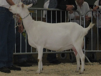 Pas in 2002 werd de fokkerij weer serieus opgepakt. Durk kocht twee lammeren van familie de With. Celine (vader: Freark K) was daar een van. "Ze was drachtig van Walperter Gerwin." Uit deze combinatie komt Celine 3 voort, de oude geit die nog steeds bij Durk op stal staat. "Haar volle zus Celine 2 was eigenlijk iets beter, maar zij kreeg op jonge leeftijd uierontsteking." Celine 3 wordt niet meer gedekt. "Ze mag blijven lopen tot het niet meer gaat. Zoals ze er nu bij staat, gaat ze nog wel een tijdje mee." Met zijn ideaalbeeld Grietje 34 van Klaas Jongschaap in het achterhoofd, een geit die hij als jongetje op de keuring nog heeft gezien, speurt Durk naar dieren die dit type kunnen evenaren. Hij let daarbij vooral op de middenhand. "Ik heb het idee dat geiten met een ruime middenhand en sterk beenwerk ouder kunnen worden dan geiten die deze eigenschappen niet hebben." Om die reden heeft Durk een bokje besteld uit Nooro’s Roza 9 van Huib Noordermeer. "Een geit die net als Marijke 90 goed in balans is. Geiten hoeven van mij niet groot te zijn. Ze moeten vooral een tijd mee kunnen." |