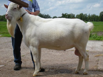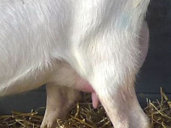 Het fokken van geiten met vooruier is voor Roel al jaren het ultieme fokdoel. Bij Maisy 67 (hier als jaarling) komt dit goed naar voren. |