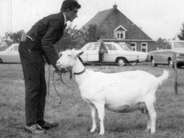 Hadrianus, gefokt door dokter Hagedoorn uit Soesterberg, zorgde ervoor dat de dieren van Maat uitblonken in hoogtemaat. ‘Ze waren voor die tijd erg moderne geiten.’ Dochters Sweachmer Trijntje 17 en 18 hebben in de Nederlandse fokkerij hun sporen achtergelaten. ‘Trijntje 17 heb ik later verkocht aan Post uit Olst. Die geit was een taaie melker. Uit Trijntje 18 fokte ik met de bok Peter van Coehoorn nog Trijntje 23. Op de Nationale tentoonstelling 1975 in Leeuwarden stonden Trijntje 17 en 18 1B en 1A en Trijntje 23 werd toen reservekampioen bij de eenjarige geiten.’ De bokken van Maat vind je in veel stambomen terug. Sweachmer Eddie en Sweachmer Egbert zijn de bekendste. De laatstgenoemde werd op de bokkenkeurig in Friesland nog afgekeurd. ‘Hij werd toen verkocht naar Overijssel. Daar hebben ze ‘m opgelapt en heeft hij nog bij onder meer Kuipers uit Eibergen en Jongschaap uit Giethoorn voor nakomelingen gezorgd. Een groep afstammelingen van Sweachmer Egbert kreeg op de Nationale in Utrecht een 1A.’ |