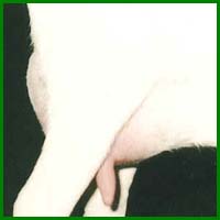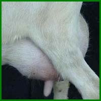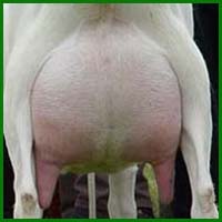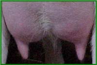 Recht naar beneden, iets binnen de uier geplaatste spenen.