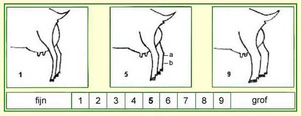 Het wel of niet aanwezig zijn van vochtweefsel tussen vel en bot rondom het spronggewricht (a) en het pijpbeen (b).