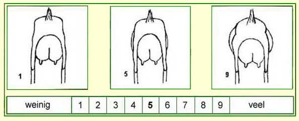 Beoordeling van de dikte van het spierenpakket in de bovenbouw en de achterhand, en de bespiering van de nek.